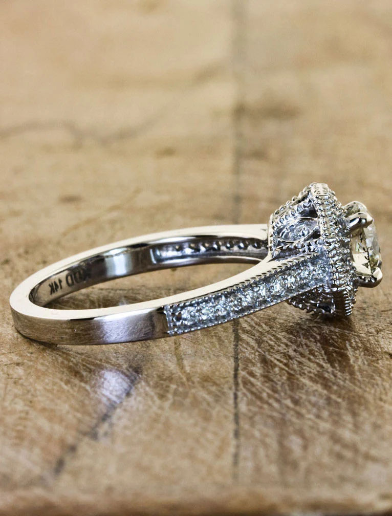Almira dazzles with a round center stone encircled by an ornate halo, where geometric precision meets a cascade of pavé brilliance, filigree, and fine milgrain. A striking blend of vintage grandeur and dramatic elegance, it transforms every glance into a moment of awe. She pairs beautifully with the Nadina.
