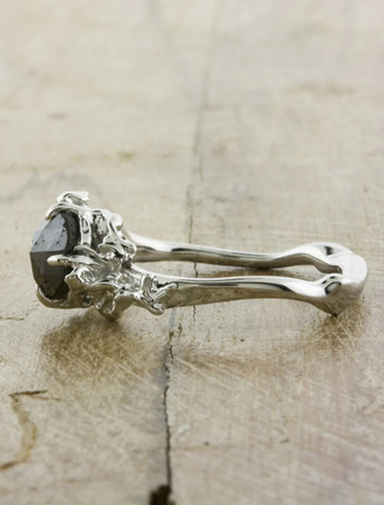 This unique engagement ring features a stunning 1 carat rose-cut black diamond. The Hazel was inspired by the essence of a delicate rosebud, complete with organic flourishes.Ā The setting is crafted in recycled 14k white gold. Pairs beautifully with the Flora wedding band for a unique bridal ensemble.Ā Handmade in NYC.Ā