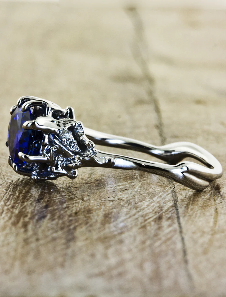 This custom design features an approx 3ct oval cut sapphire in an organic 8-prong setting, made especially for this sizable gemstone. The radiant blue natural Ceylon sapphire has an almost aquatic feel in this nature-inspired setting. Handmade in NYC.