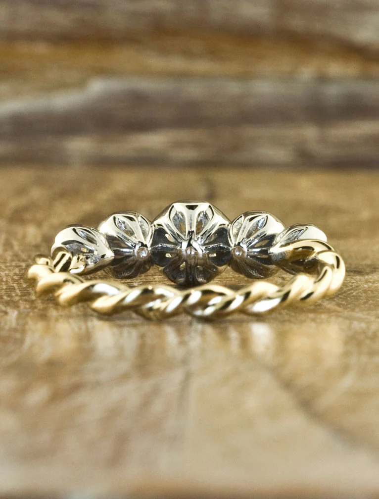 Our Client wanted to present roses to his girlfriend which he had never done.  We brought this idea to life by sourcing him some glorious rose cut diamonds and using a rope band to symbolize their lives coming together with this promise of forever. This is the perfect design for someone looking for a low profile engagement ring. Her approximately 1.00 tcw rose cut diamonds complete the rose bouquet.  Â
