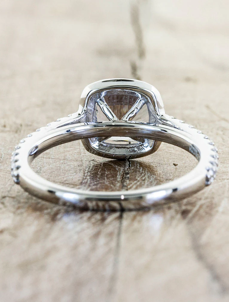 The Serena features a 1.46 ct bluish/grey natural cushion cut sapphire just like the client requested. In addition, 0.30 cts of brilliant diamonds surround this majestic center stone and line the band. She is set in 14k white gold. Ideal for someone that desires a setting with lots of sparkle and the color of the sky.