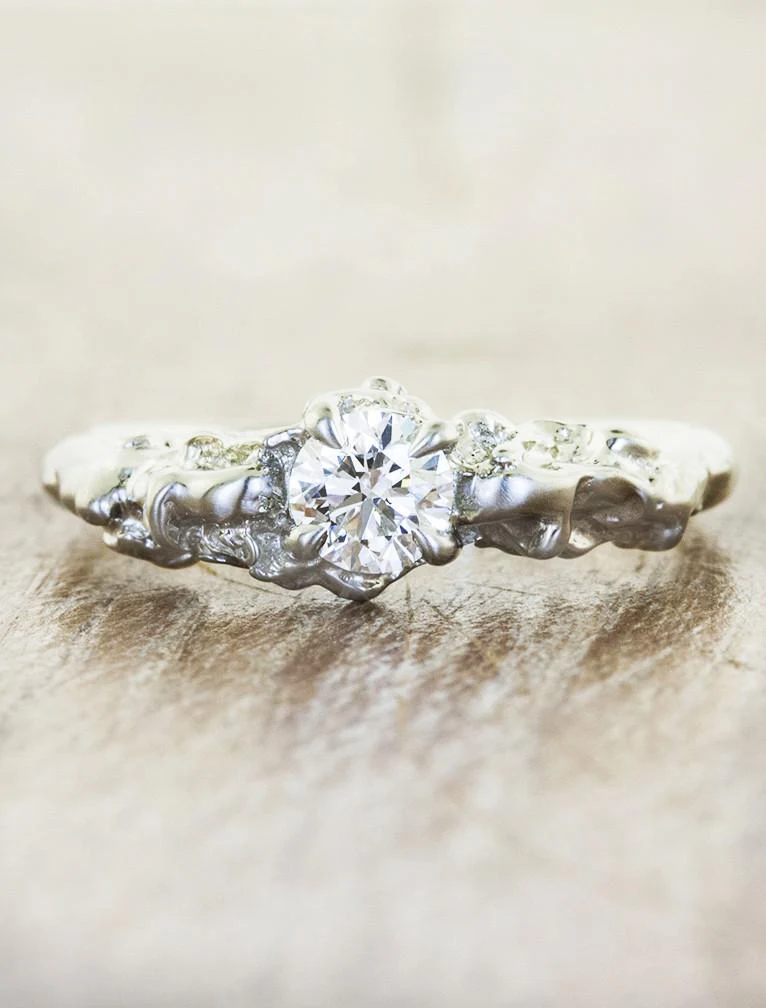 The Sienna engagement ring is organic and sculptural. It features a brilliant 0.25 carat diamond set in a recycled 14k gold setting. The white gold version of this piece is not rhodium plated, so as to highlight the natural color and texture of white gold. Perfect for someone who fancies a unique engagement ring with organic flourishes. Handmade in NYC.Â