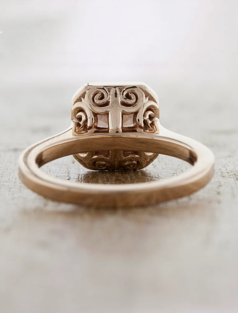 We sourced a brilliant and rare Padparadscha sapphire and set it in a rose gold band with a white diamond halo and pave that runs down not only the sides. Underneath the basket there is a peek- a - boo of design and intricacy. Â