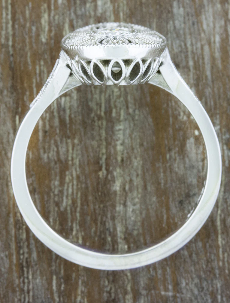 Aurelia oozes refinement and elegance with tons of vintage appeal. She's an Edwardian inspired design with an intricate band featuring beautiful filagree and milgrain details along each side and sparkles like you wouldn't believe.  She is set with brilliant white diamonds weighing 0.33ct. She is so majestic that she completely takes your breath away at first glance. Her ornate basket is a magnificent surprise.Â